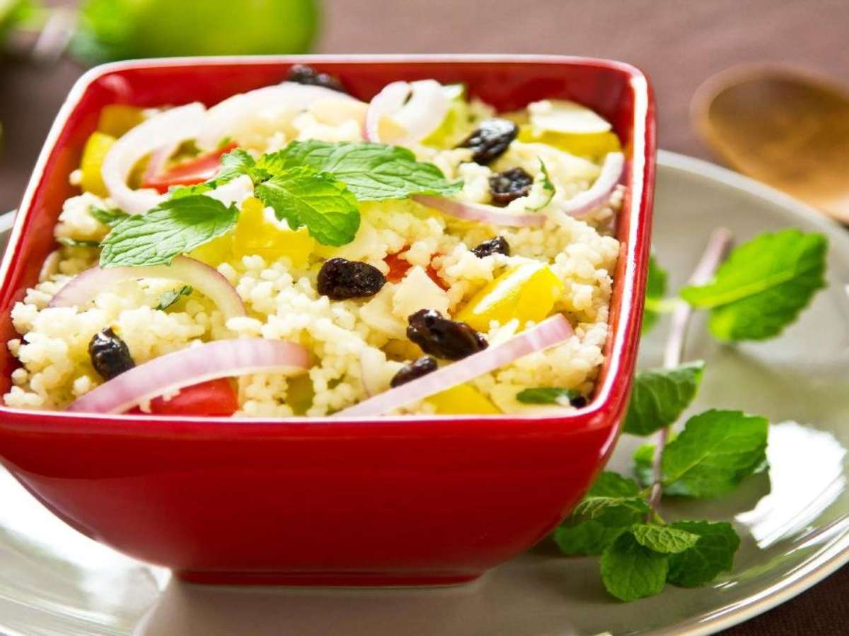 Modo de preparo: Em uma tigela grande, coloque o cuscuz marroquino e regue com a água com o caldo de legumes dissolvido. Tampe a tigela e deixe descansar por 1 hora. Escorra o excesso de água e solte o cuscuz com um garfo. Adicione a cebola, o tomate, o suco de limão, a uva-passa, o azeite, a salsa, a hortelã e acerte o sal. Misture bem e transfira para uma travessa. Decore com folhas de hortelã e sirva.