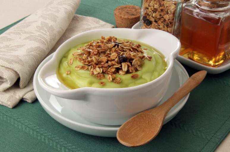 No liquidificador, bata a polpa do abacate, o leite, o suco de limão e a frutose até ficar homogêneo e liso. Transfira para taças individuais, polvilhe com granola, regue com mel e sirva em seguida.