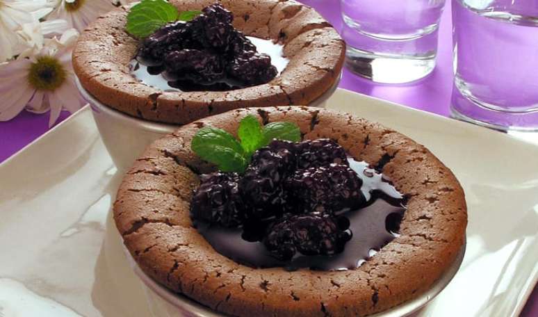 Em uma panela, coloque o chocolate, a farinha de trigo, o café, o açúcar, a manteiga e o leite. Leve ao fogo baixo e deixe cozinhar mexendo, com um batedor manual, por 10 minutos ou até obter um creme liso. Retire do fogo e transfira para uma tigela. Junte as gemas, uma a uma, batendo até obter uma massa homogênea. Por último, na batedeira, bata as claras em neve e misture delicadamente com a massa, até ficar uniforme. Despeje a massa em 6 forminhas individuais para minibolos, untadas e enfarinhadas. Leve ao forno médio, preaquecido, por 20 minutos ou até que ao enfiar um palito, ele saia limpo. Para a calda, coloque os ingredientes em uma panela e leve ao fogo baixo, mexendo de vez em quando, por 10 minutos ou até obter uma calda encorpada. Desenforme os bolinhos e cubra com a calda. Se desejar, decore com amoras frescas e folhas de hortelã.