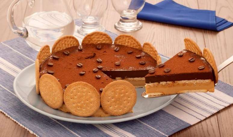 Forre o fundo e a lateral de uma forma de aro removível com 24 cm de diâmetro com biscoitos. Misture o creme de leite com o doce de leite até ficar homogêneo e espalhe sobre a forma alisando com uma espátula. Faça uma camada de biscoito. Derreta o chocolate em banho-maria ou microondas e deixe esfriar. Misture o creme de leite e o café e espalhe sobre a torta. Leve à geladeira 4 horas. Desenforme. Polvilhe cacau e decore com grãos de café antes de servir.
