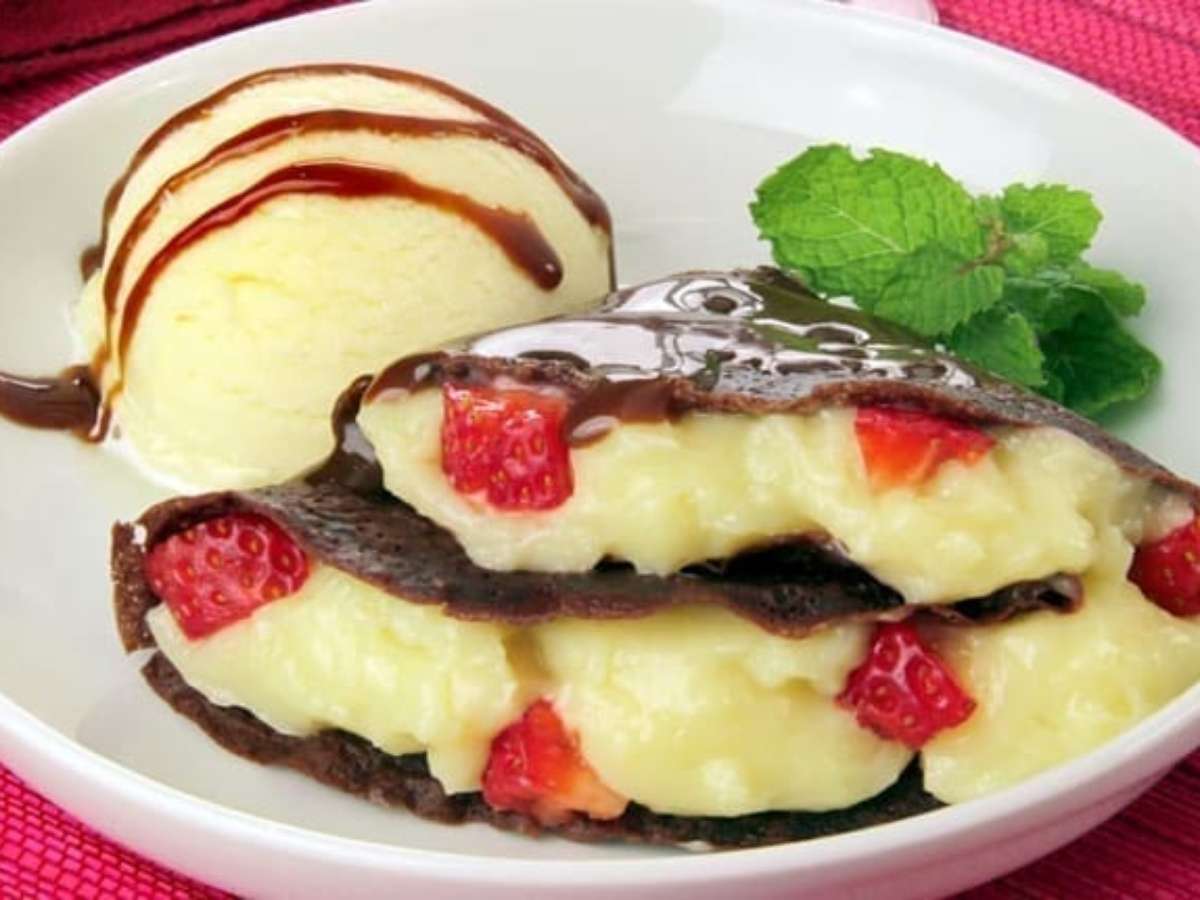 Para o recheio, em uma panela, leve ao fogo médio o leite condensado, o leite, a gema e a maisena, mexendo até engrossar. Retire do fogo, junte o creme de leite, misture e deixe esfriar. Para a massa, bata no liquidificador os ovos, o leite, o chocolate, o açúcar, o óleo e a farinha até ficar homogêneo. Aqueça uma frigideira antiaderente média untada, em fogo médio, e coloque uma concha média de massa. Gire para cobrir todo o fundo e deixe cozinhar por 3 minutos de cada lado. Faça o mesmo procedimento com toda a massa. Misture os morangos ao recheio e espalhe um pouco do recheio em metade da massa. Dobre a massa em 2 partes e arrume em um prato. Sirva acompanhado de sorvete de creme e decorado com calda de chocolate e folhas de hortelã.