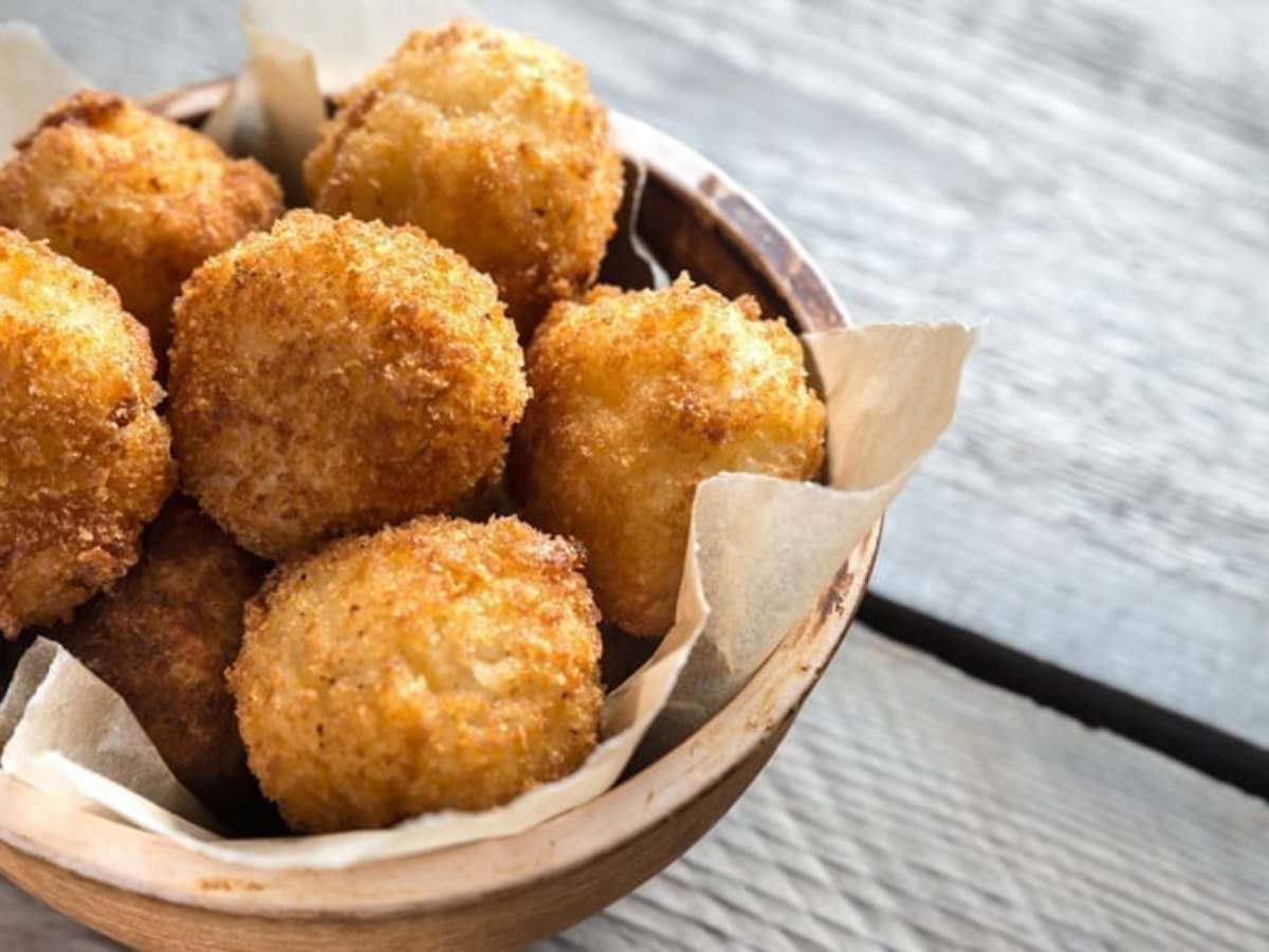 Em uma tigela, misture o leite, o arroz, o tempero, o ovo, o cheiro-verde, a margarina, a farinha e sal até formar uma massa homogênea, se necessário adicione mais farinha. Abra porções da massa na mão, recheie com os ingredientes do recheio misturados e feche formando bolinhas. Empane na farinha de trigo e frite, aos poucos, em óleo quente. Escorra em papel-toalha e sirva em seguida.