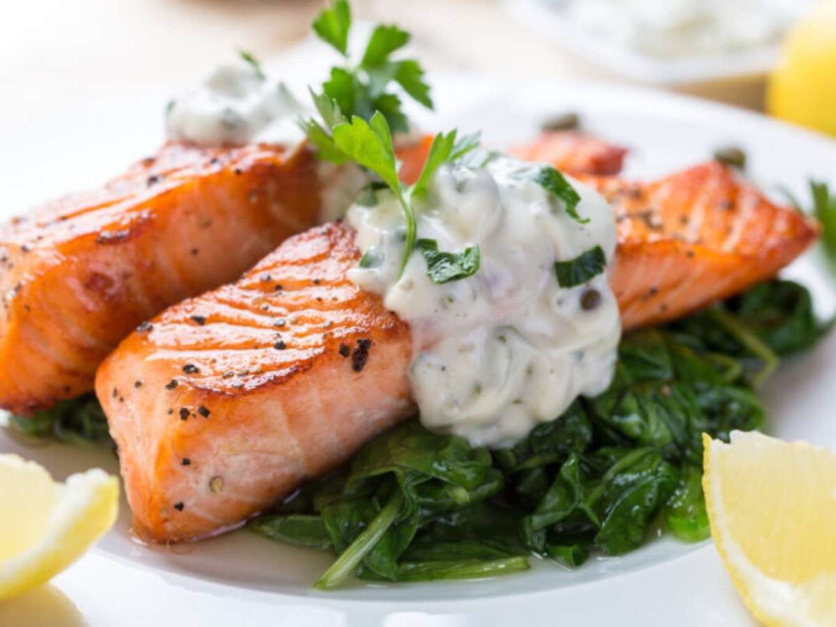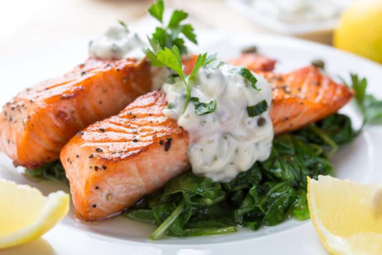 Para o molho, cozinhe o espinafre em água e sal por 5 minutos. Retire, escorra e esprema para que saia todo o líquido. Aqueça uma panela com a manteiga, em fogo médio e refogue o alho e o espinafre por 3 minutos. Adicione o creme de leite, tempere com sal, misture e desligue o fogo. Reserve. Tempere o salmão com o tempero e com sal. Derreta a manteiga em uma frigideira com grelha, em fogo médio e grelhe os filés por 3 minutos de cada lado, sem deixar que dourem muito. Coloque em uma travessa e sirva com o molho.