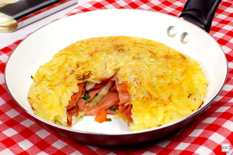 Cubra com o restante da batata apertando levemente. Frite por 5 minutos em fogo baixo. Vire sobre um prato e vire novamente sobre a frigideira para dourar do outro lado. Transfira para um prato e sirva.