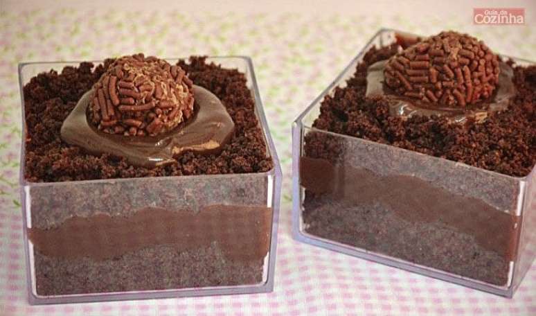 Para o brigadeiro, leve os ingredientes ao fogo médio em uma panela, exceto o creme de leite, mexendo até desgrudar do fundo da panela e engrossar. Misture com o creme de leite e deixe esfriar. Em potes ou copinhos transparentes, faça uma camada de bolo, uma de brigadeiro e mais uma de bolo. Decore com um pouco de brigadeiro na superfície e com um brigadeiro pronto enrolado. Tampe e leve à geladeira até o momento de servir.