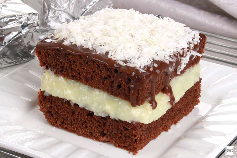 Regue sobre o bolo, cubra com o coco e corte em pedaços.