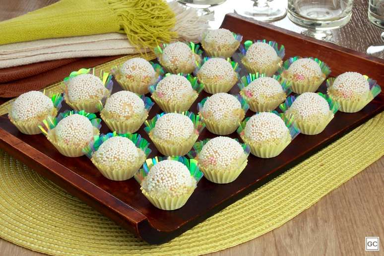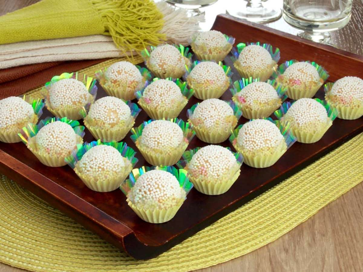 Com as mãos untadas, modele bolinhas e passe pelos confeitos.