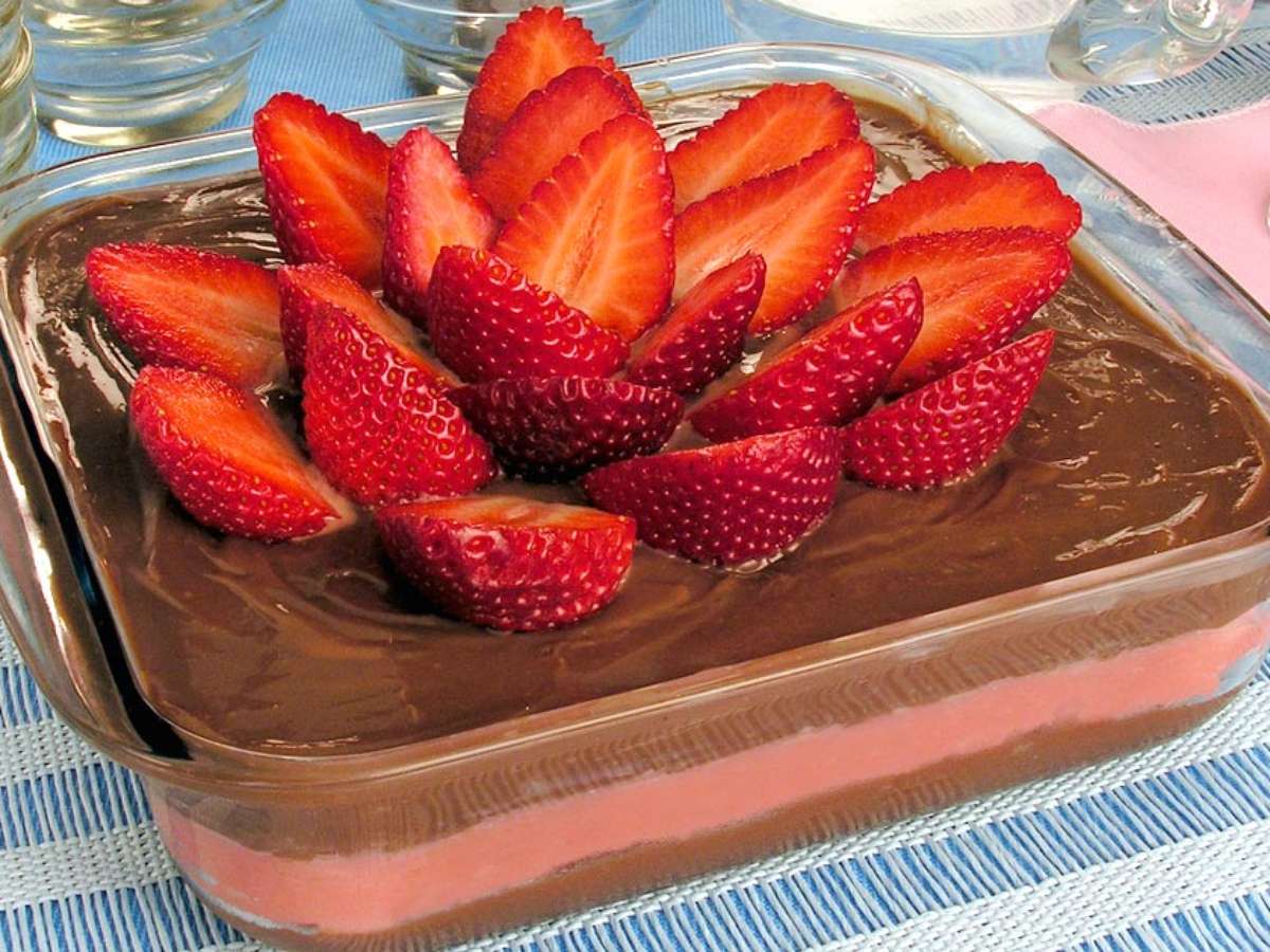 Decore com os morangos cortados ao meio e sirva.