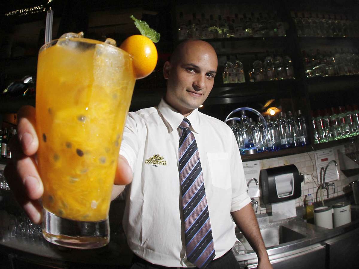 Em um copo longo, coloque duas colheres de maracujá, quatro cubos de manga e dois quartos de lima-da-pérsia (com casca). Macere as frutas com o açúcar. "Três socadas são o suficiente. Mais que isso deixa a caipirinha amarga e as frutas perdem o sabor"