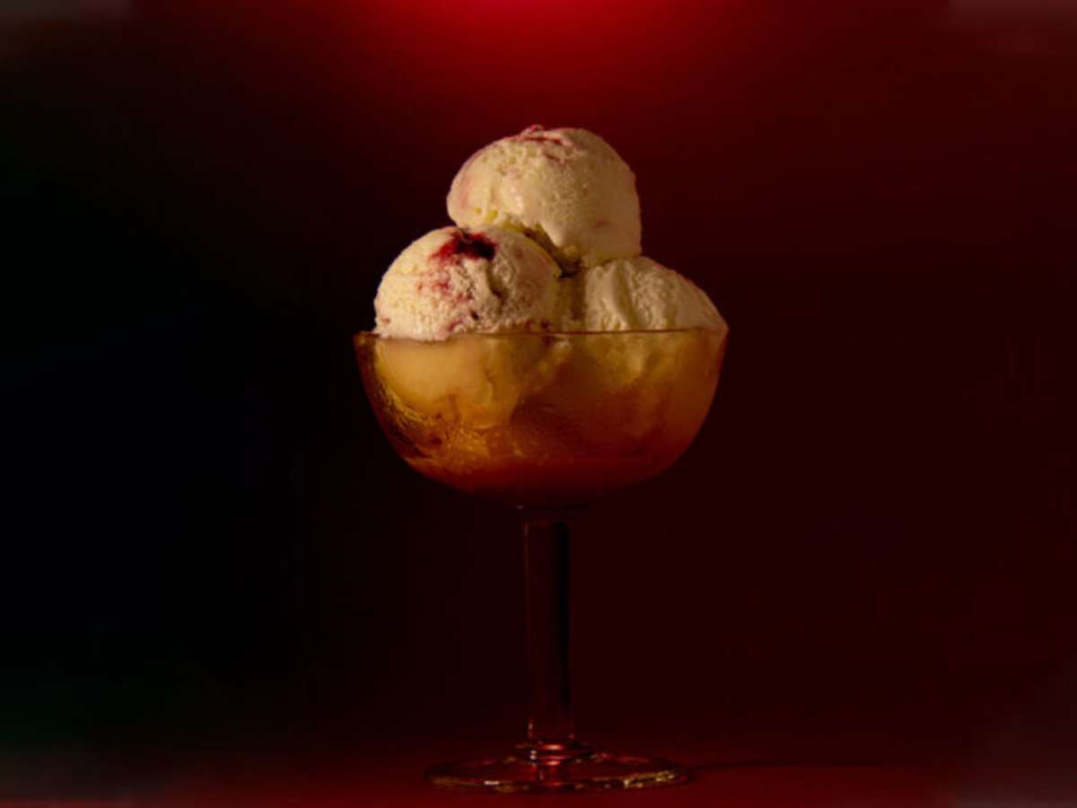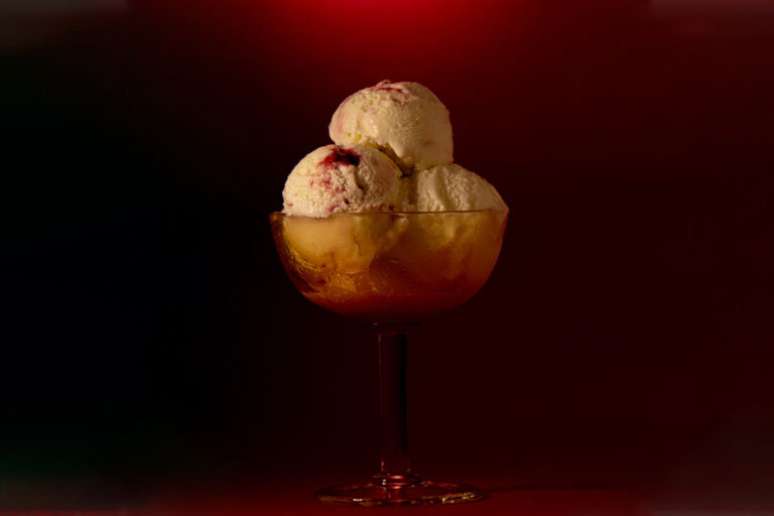 Sorvete: Bata todos os ingredientes do sorvete no liquidificador. Despeje numa fôrma refratária funda e leve ao congelador até começar a ficar firme na borda. Retire o sorvete do congelador e bata aos poucos na batadeira. Coloque na vasilha novamente e leve ao congelador até ficar firme. Calda: Coloque todos os ingredientes numa panela e leve ao fogo até ferver. Abaixe o fogo e cozinhe por 5 minutos ou até engrossar ligeiramente. Retire o sorvete do congelador 10 minutos antes de servir e regue com a calda fria.