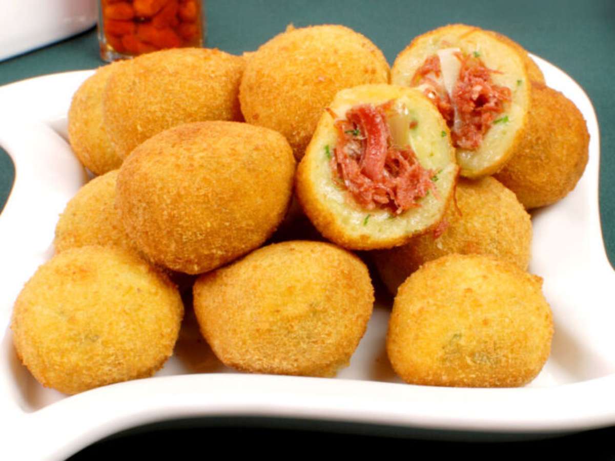 Bolinho de mandioca com alho-poró e carne-seca