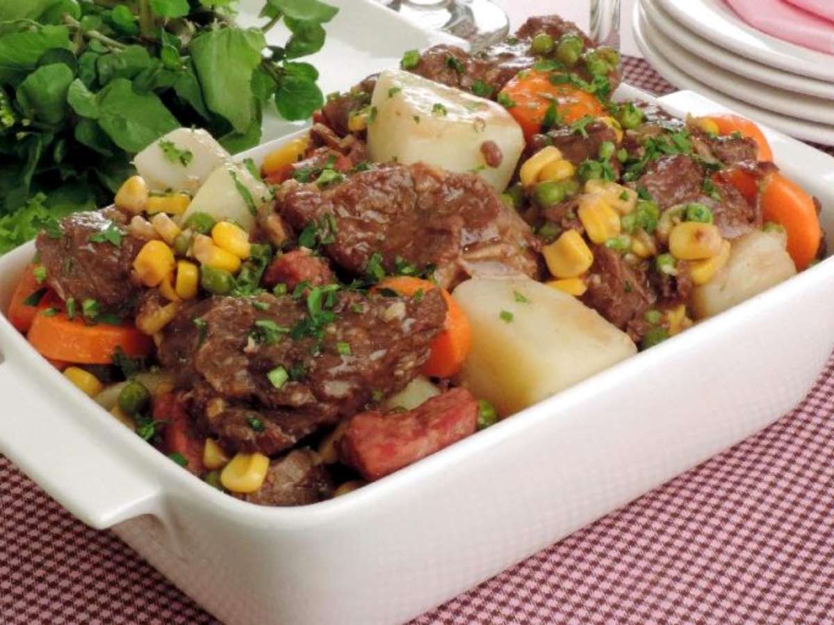 Volte ao fogo médio e cozinhe com a panela semiaberta até a carne e os legumes amaciarem. Coloque o milho e a ervilha por último, deixe por 2 minutos e desligue o fogo. Transfira para uma travessa e sirva, se desejar, acompanhada de salada de folhas verdes.