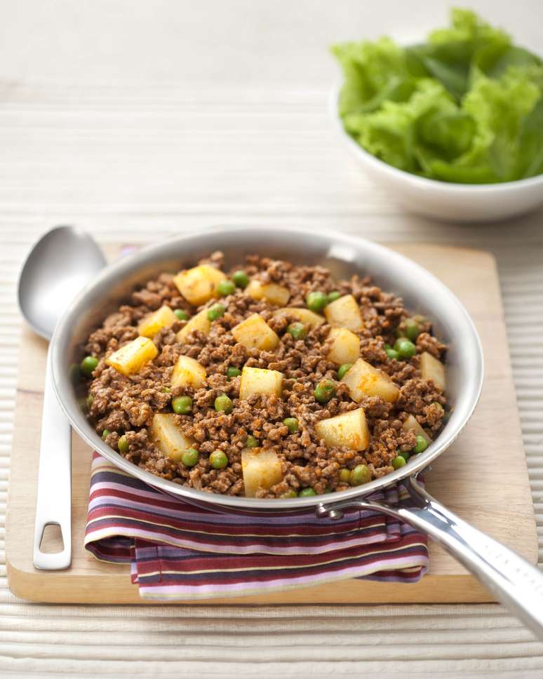 Em uma panela, aqueça o óleo e refogue a carne moída, até secar toda a água. Junte as batatas, o extrato de tomate e caldo de carne dissolvido na água fervente. Cozinhe em fogo alto com a panela semitampada por cerca de 15 minutos ou até que as batatas estejam macias. Se desejar, acrescente à carne as ervilhas frescas nos cinco minutos finais do cozimento.