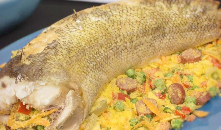 Peixe assado recheado com farofa colorida