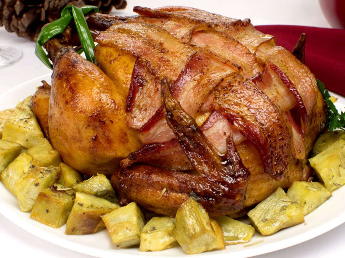 Chester ao molho de laranja e vinho coberto com bacon