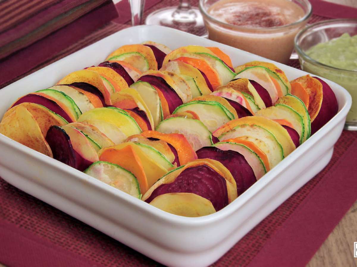 Em um mandolim fatie separadamente a abobrinha, a batata, a cenoura, a mandioquinha e a beterraba.