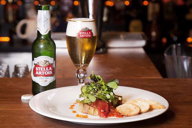 Estabelecimento: Dometila Café - José Bonifácio + cerveja Stella Artois | Petisco: sanduíche de carne de panela com tomate, champignon, mussarela e catupiry no pão ciabata integral | Bebida: cerveja Stella Artois long neck. Opcional: chá gelado