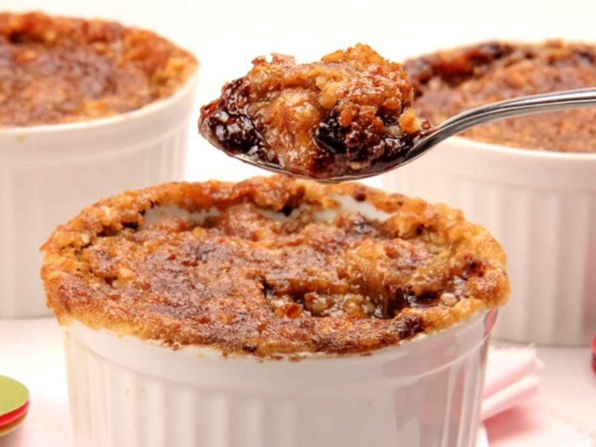 Distribua entre os ramequins, sobre a banana, coloque em uma fôrma e leve ao forno médio (180ºC), preaquecido, por 20 minutos ou até dourar. Deixe amornar e sirva em seguida.