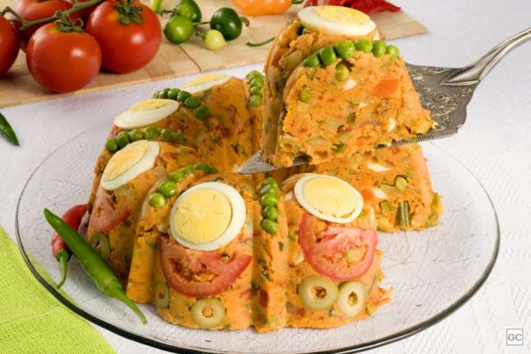 Em uma fôrma de buraco no meio média, faça uma decoração colocando nas laterais e no fundo rodelas de tomate, de ovo cozido, azeitona e ervilha. Com o que restou da decoração, pique e coloque na panela junto com o pimentão.