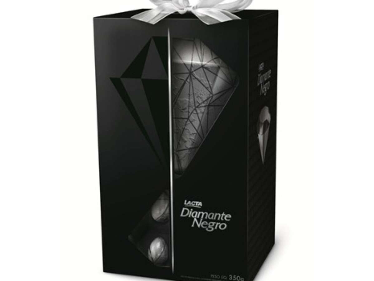 Diamante Negro produzido com cristais crocantes em formato de diamante. Da Lacta. Por R$ 59,99 (350g). SAC: 0800 704 1940