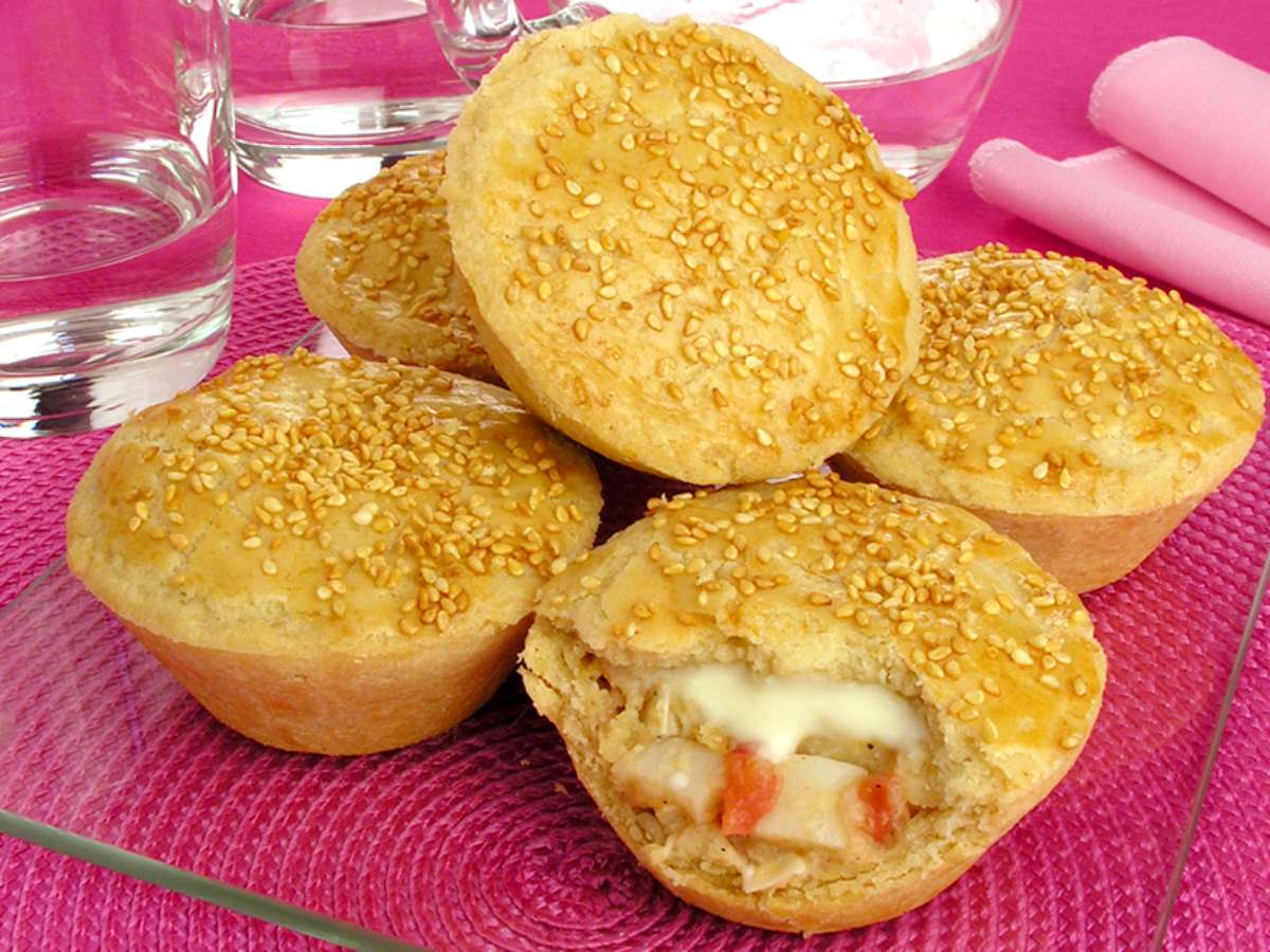 Pincele com o ovo e polvilhe com semente de gergelim. Coloque as forminhas em uma fôrma grande e leve ao forno médio, preaquecido, por 20 minutos ou até dourar. Desenforme e sirva.