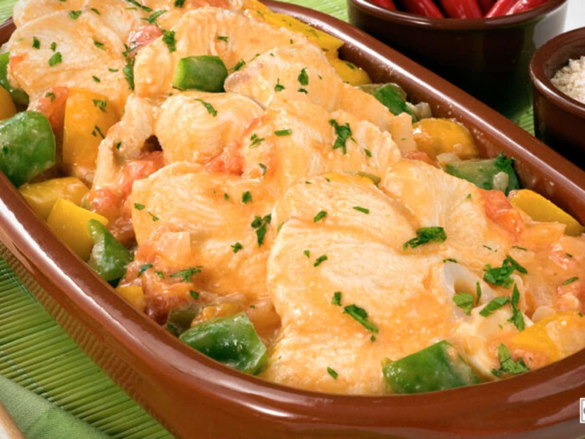 Regue com azeite, tempere com sal e, sobre elas, coloque o peixe temperado. Cubra com o pimentão, a cebola, o alho-poró, o tomate e a azeitona.
