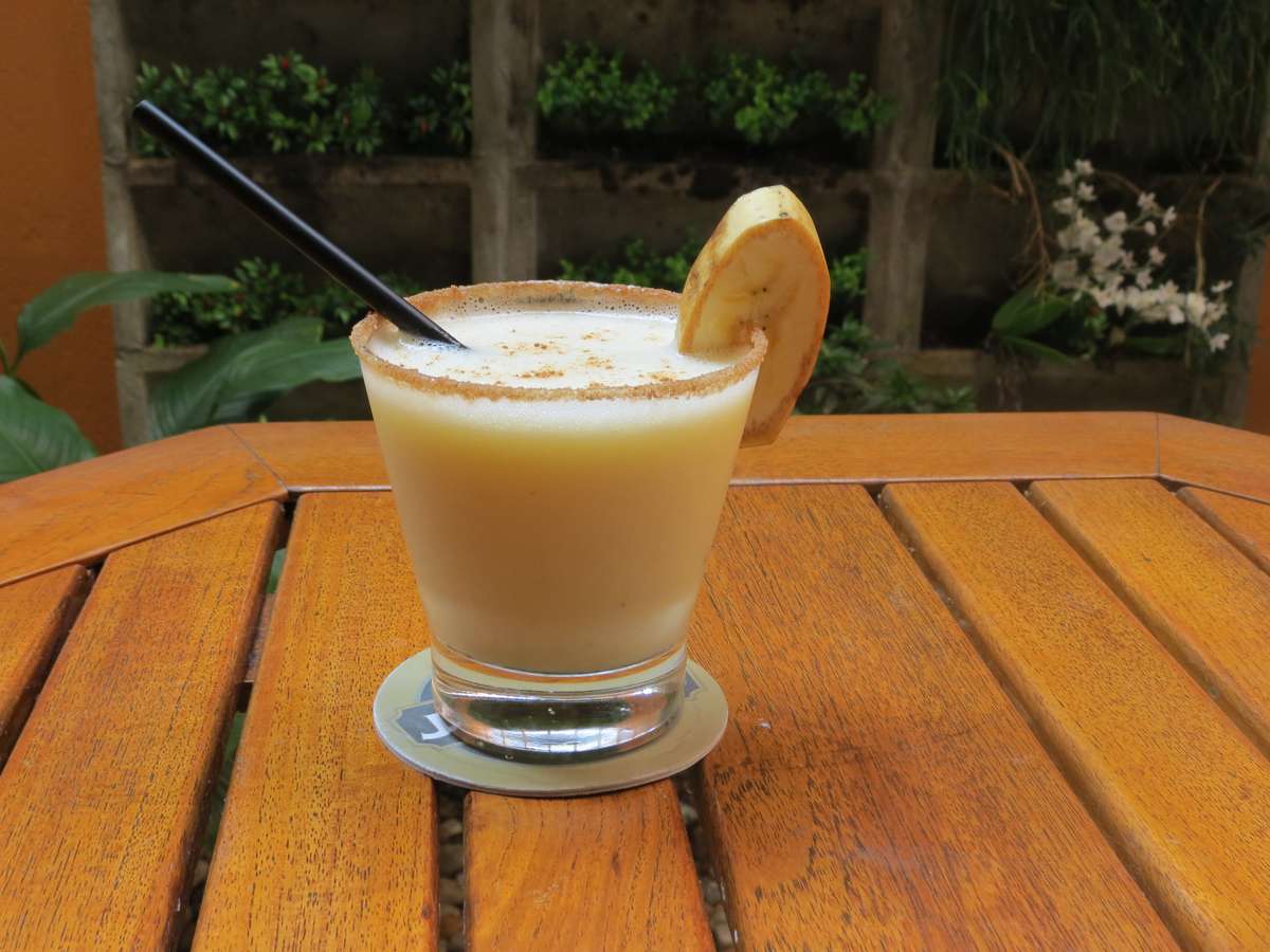 Bata no liquidificador a banana, o suco de limão, a cachaça de banana, a bebida destilada e as quatro pedras de gelo. Depois disso, despeje a mistura no copo, deixe a borda do copo com açúcar e canela e sirva em seguida.