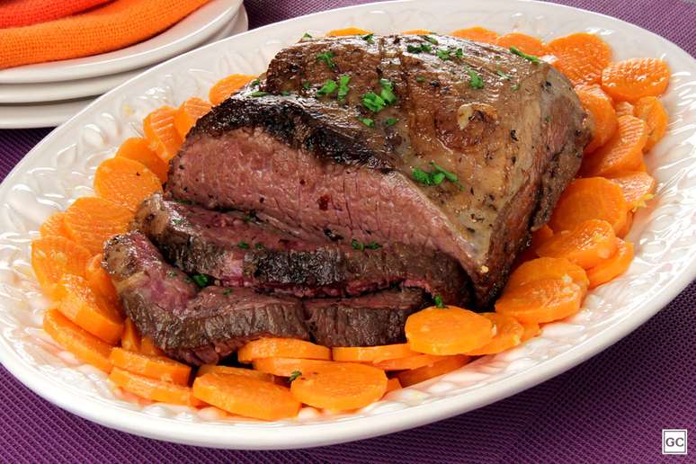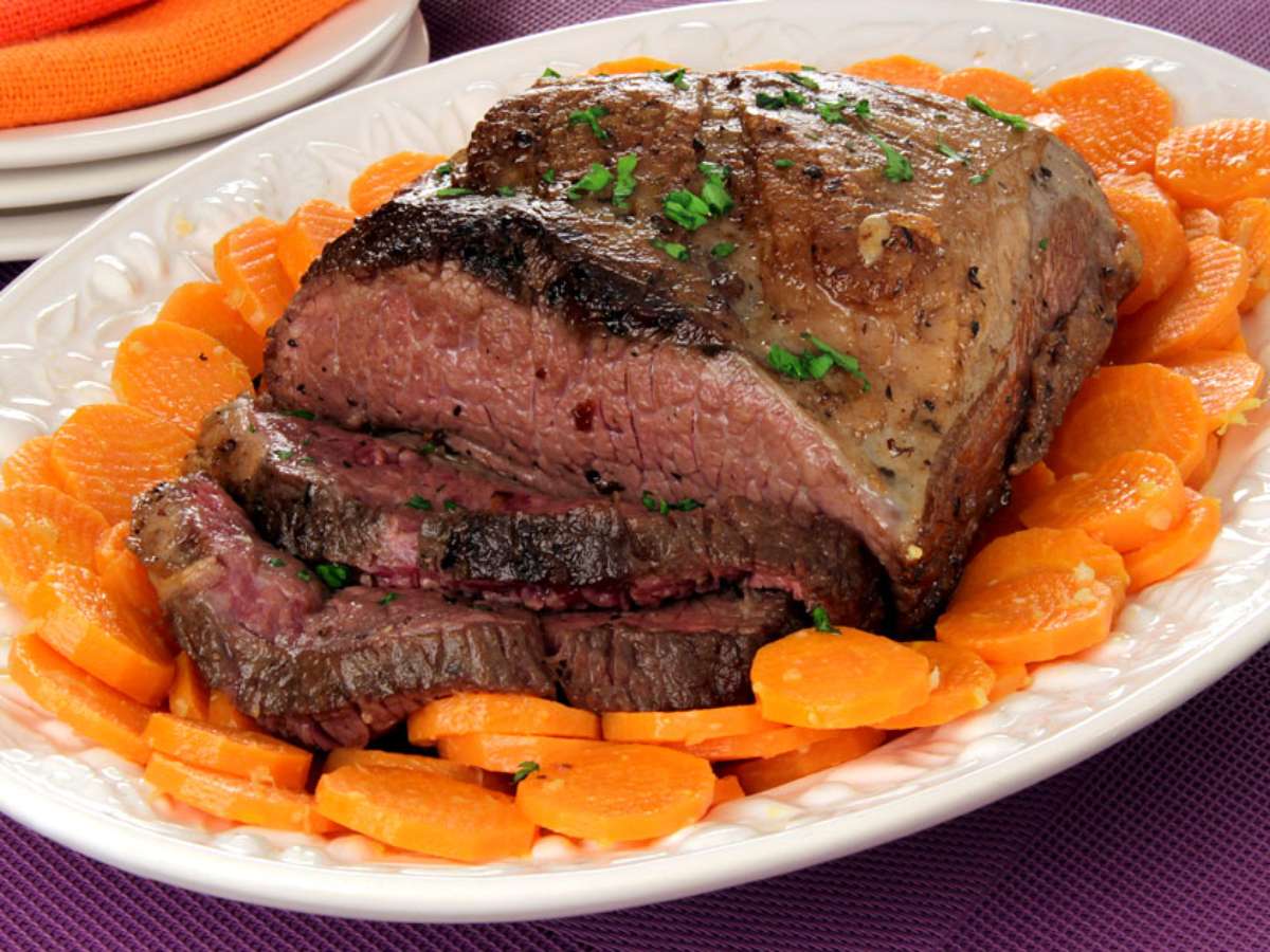 Em uma travessa, arrume a maminha fatiada e as cenouras.