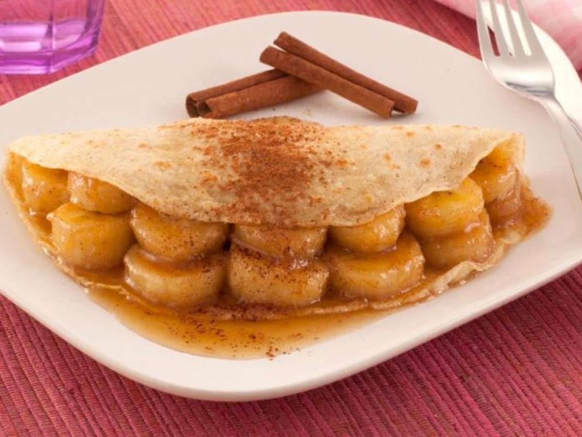 Para o recheio, em uma frigideira, em fogo médio, aqueça a manteiga. Junte a banana, o açúcar, canela e cozinhe por 3 minutos.