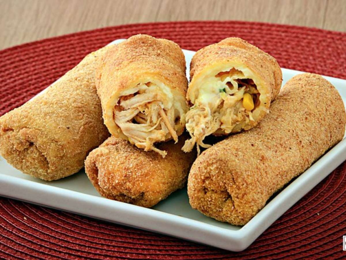 Retire e repita o procedimento com a massa restante. Divida o recheio e o Catupiry® entre as massas, enrole como rocamboles, virando as pontas para dentro, e prenda com palitos. Passe nos ovos restantes batidos e empane na farinha de rosca. Frite, aos poucos, em óleo quente até dourar. Escorra sobre papel-toalha e sirva.