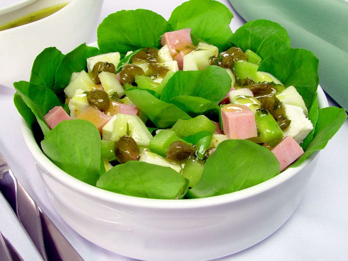 Em uma travessa grande, coloque o agrião, polvilhe com o sal, coloque o aipo, a maçã verde, o presunto e o provolone.