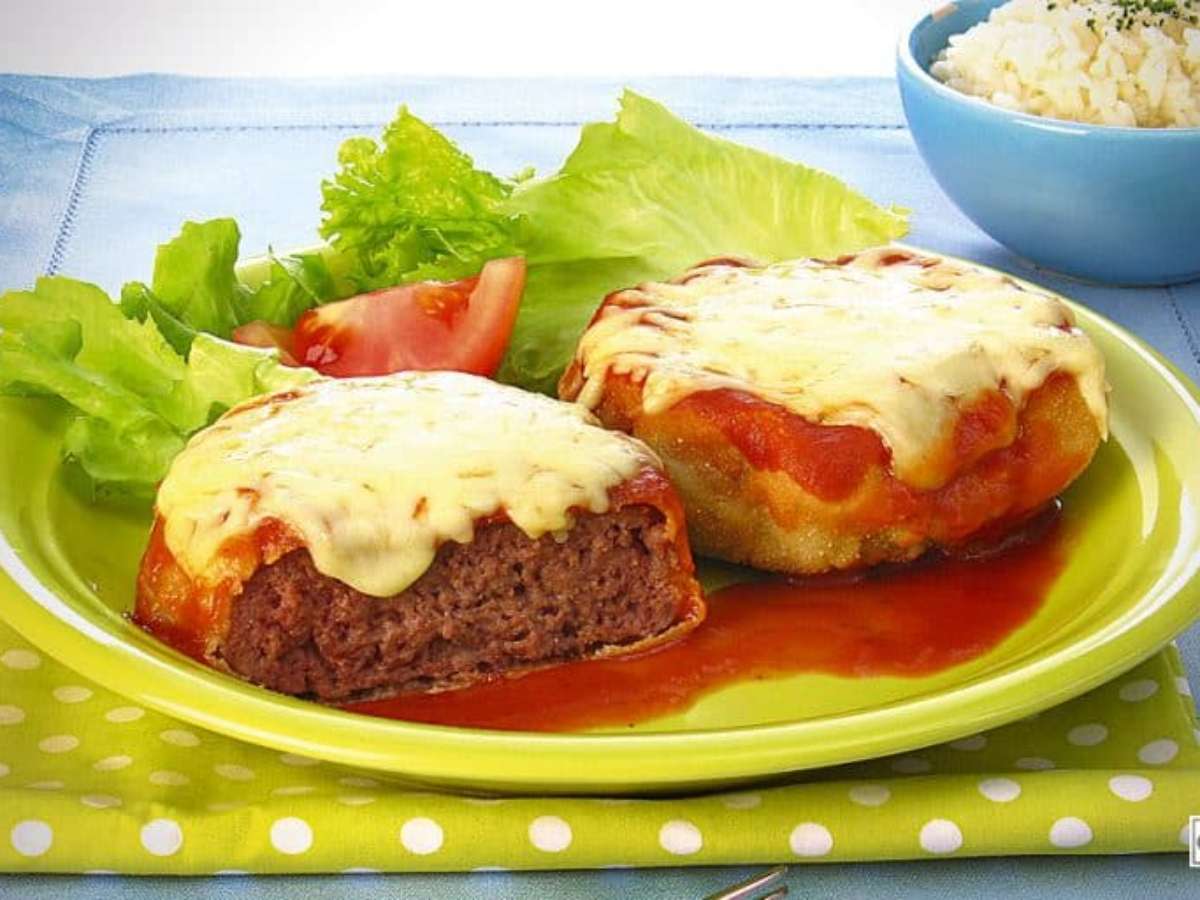 Umedeça as fatias de pão com água e aperte com as mãos para tirar o excesso. Coloque em uma vasilha, adicione a carne, a cebola, o ovo, sal e pimenta e amasse com as mãos até dar liga. Divida em 4 porções e modele hambúrgueres altos. Passe pela farinha de trigo, pelo ovo batido e na farinha de rosca. Frite, aos poucos, em óleo quente, até dourar. Escorra em papel-toalha e coloque em uma travessa. Cubra com o molho e polvilhe com o queijo. Leve ao forno alto, preaquecido, por 15 minutos ou até o queijo derreter. Sirva, se desejar, acompanhado de arroz, salada de alface e tomate.
