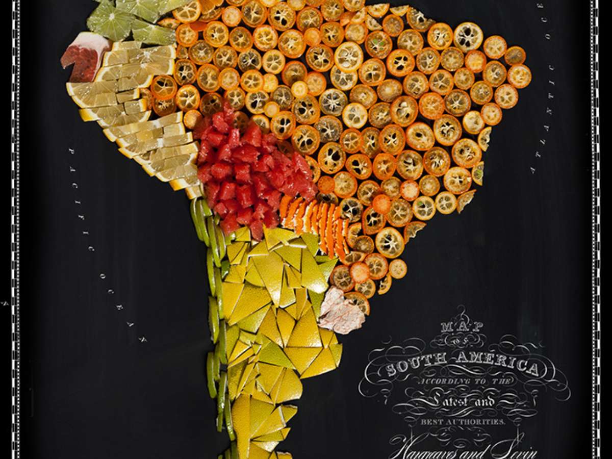 Que cada país tem comidas típicas e uma culinária particular todo mundo sabe. Mas os jovens Caitlin Levin e Henry Hargreaves decidiram demostrar isso de maneira real e criaram mapas feitos com pedaços de comida, uma forma física de representar essa diversidade mundial gastronômica. "Quem vai à França sem comer pão ou queijo? E quem faz uma caipirinha brasileira sem limão?", explicam os criadores dos mapas. Assim, o Brasil é representado com finas lascas de limão, enquanto os outros países da América do Sul são feitos com diversos tipos de outras frutas