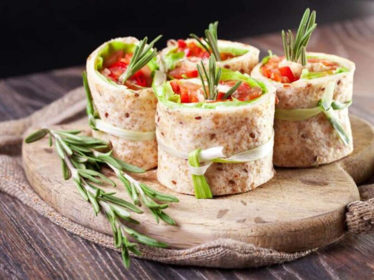 Em uma tigela, misture o tomate com a ricota. Tempere com o azeite, sal, pimenta e orégano. Sobre cada folha de Rap 10®, coloque uma folha de alface. Divida o recheio de ricota entre as folhas de Rap 10®. Enrole como rocambole e leva à geladeira por 1 hora. Corte as pontas e corte ao meio cada rolinho para que possa parar em pé. Passe os talos de cebolinha por água fervente e coloque, em seguida, em água com gelo. Escorra, seque com papel absorvente e amarre os rolinhos delicadamente para não rasgar. Corte as pontas com uma tesoura, decore com alecrim e sirva.