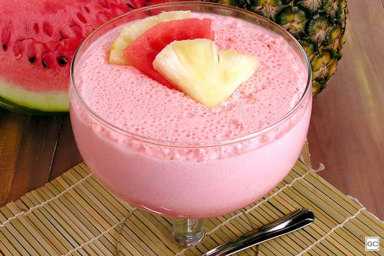 Distribua a mousse em 10 taças individuais, decore com pedaços de abacaxi e de melancia e leve à geladeira por 4 horas.