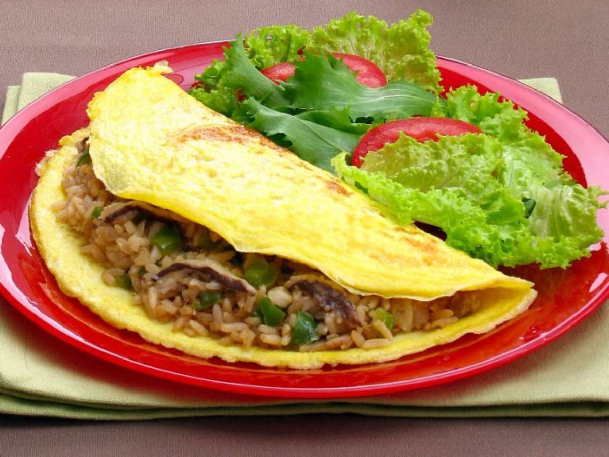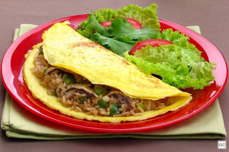 Arrume a omelete em um prato, coloque uma porção de arroz e dobre ao meio. Sirva com salada, se desejar.