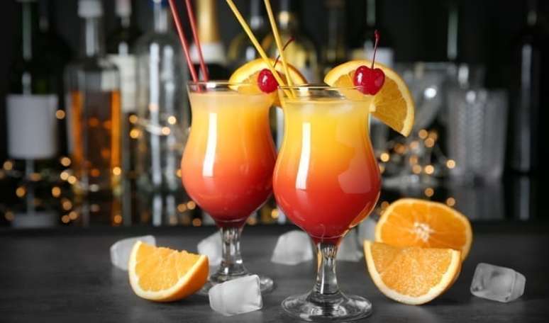 Encha um copo alto com cubos de gelo. Adicione tequila e suco de laranja. Flutue groselha e decore com laranja e uma cereja.