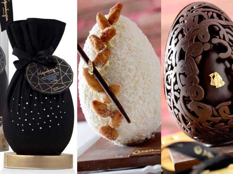 Personalizado, esse ovo é feito na frente do cliente, que escolhe desde o sabor das cascas (crocante, ao leite, 70% cacau, branco crocante, noir ou nougat) até o recheio e a mensagem do cartão de chocolate. A montagem leva 25 minutos, em média. Da Chocolat Du Jour. Por R$ 497 (unidade padrão). SAC: (11) 3168-2720