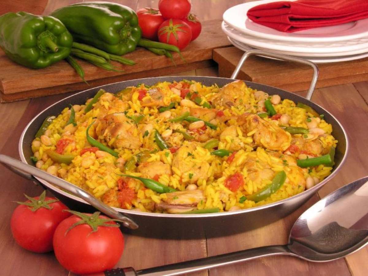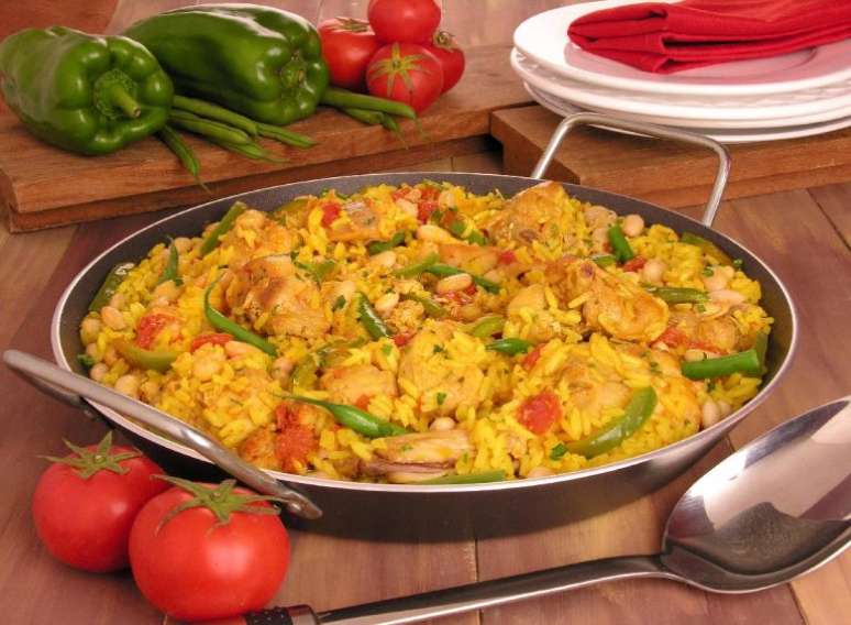 Assim como o risoto, a paella é um prato que tem o arroz como protagonista. Tão gostosa quanto, porém, menos convencional, a paella é composta por vários ingredientes e especiarias como carnes, frutos do mar, feijão verde, azeitona, páprica, alecrim, açafrão entre outros.