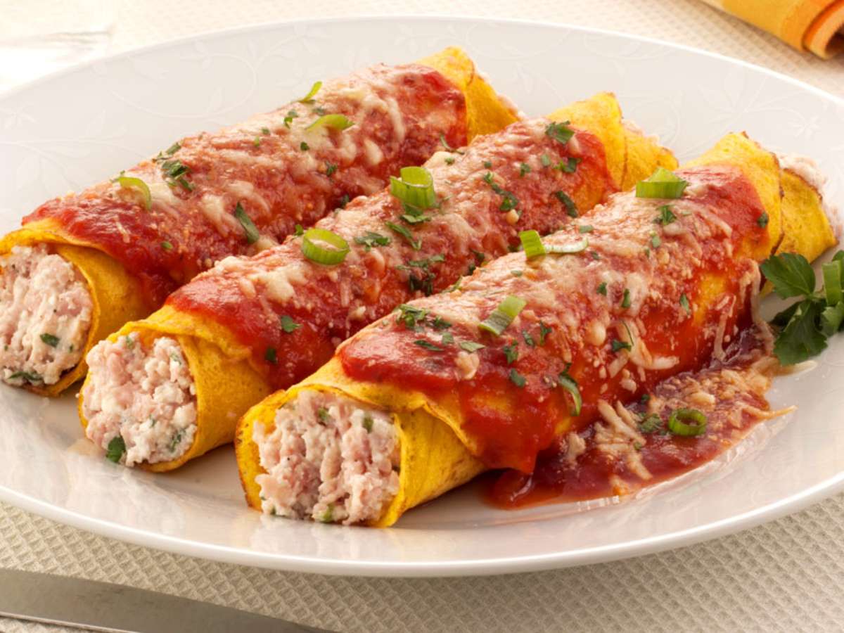 Enrole como rocambole e coloque em um refratário grande, untado com um pouco do molho.