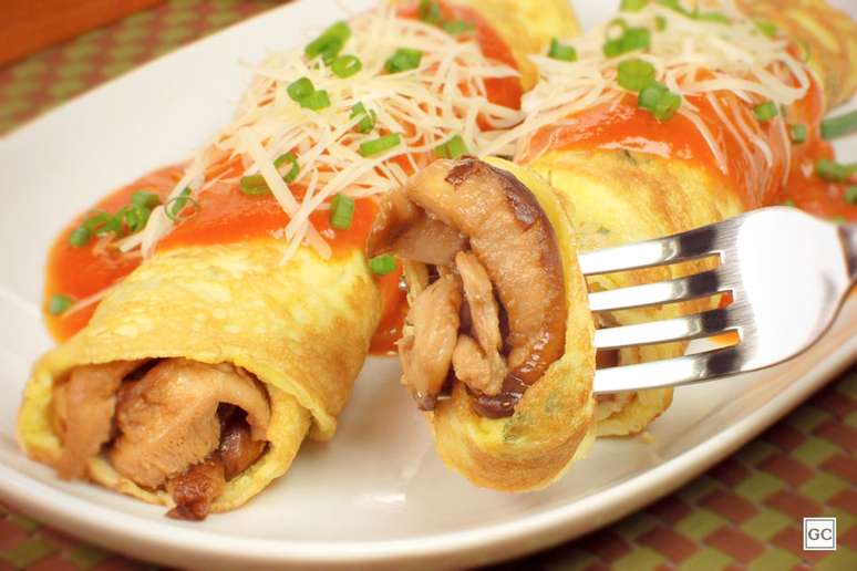 Divida o recheio entre as panquecas, enrole, coloque em uma travessa e regue com o molho.