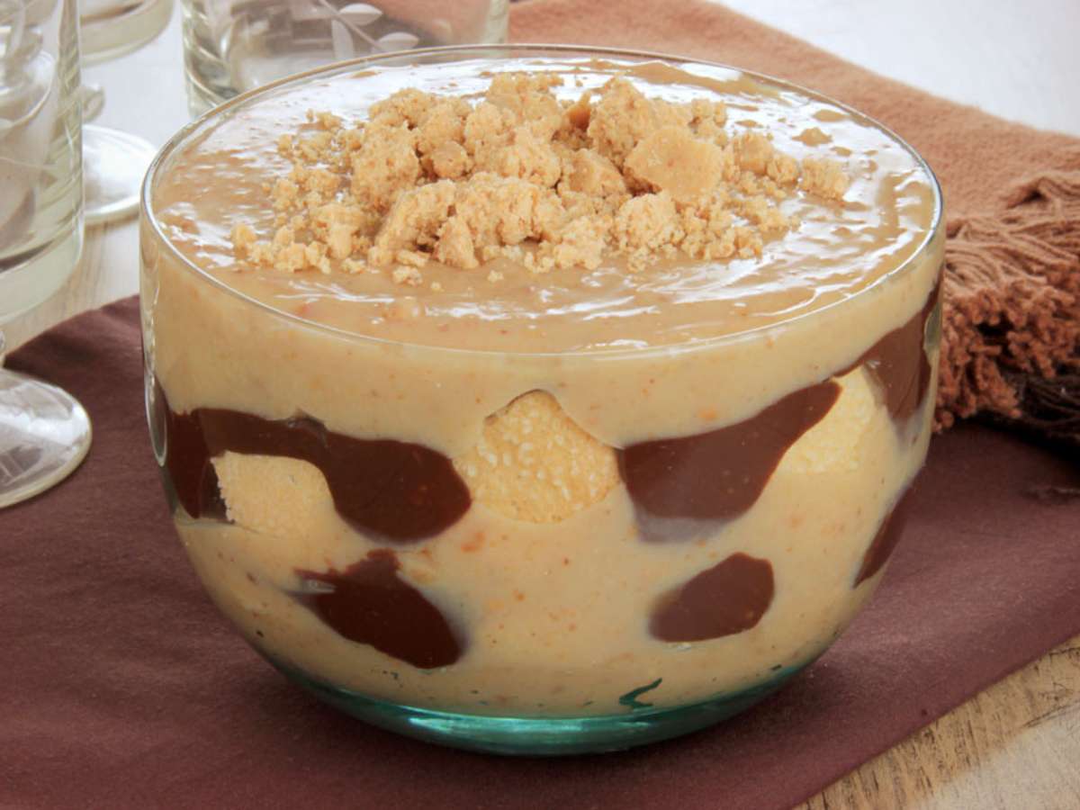 Repita as camadas até acabarem os ingredientes, terminando em creme de paçoca. Leve à geladeira por 2 horas.