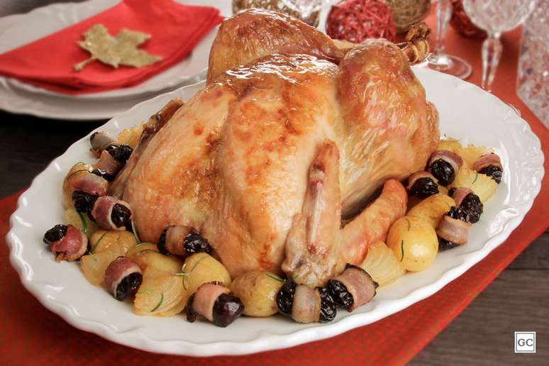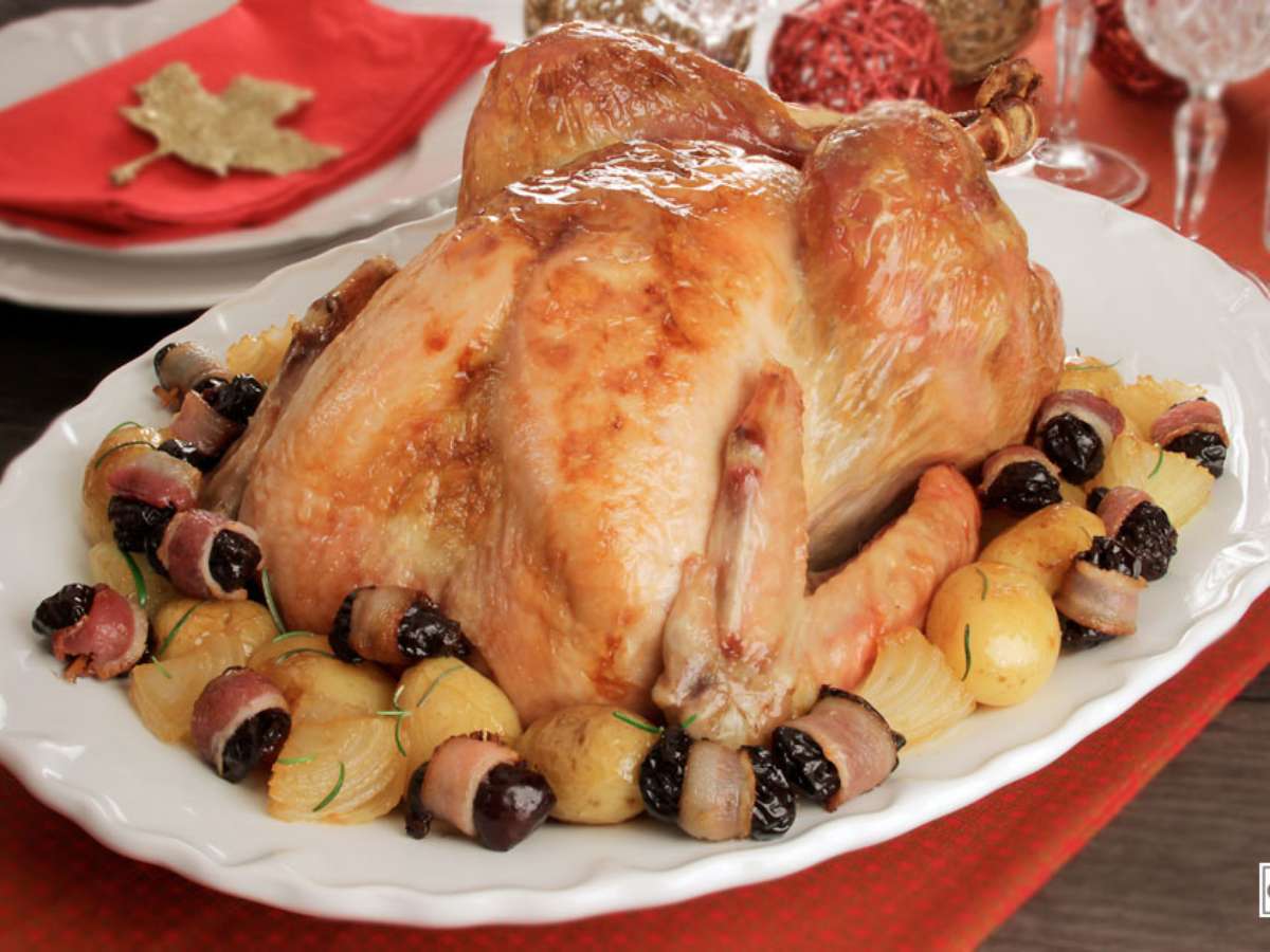 Em uma travessa, coloque o peru, retire o barbante e decore com as batatas, as cebolas e as ameixas com bacon. Sirva em seguida.