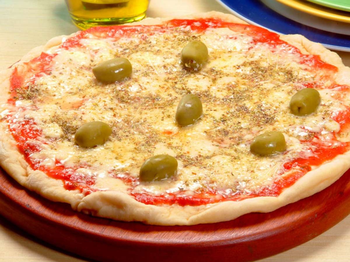 Unte uma panela de pressão com azeite e aqueça. Coloque a massa, distribua o molho de tomate, a mussarela, o parmesão, o orégano e as azeitonas por cima.