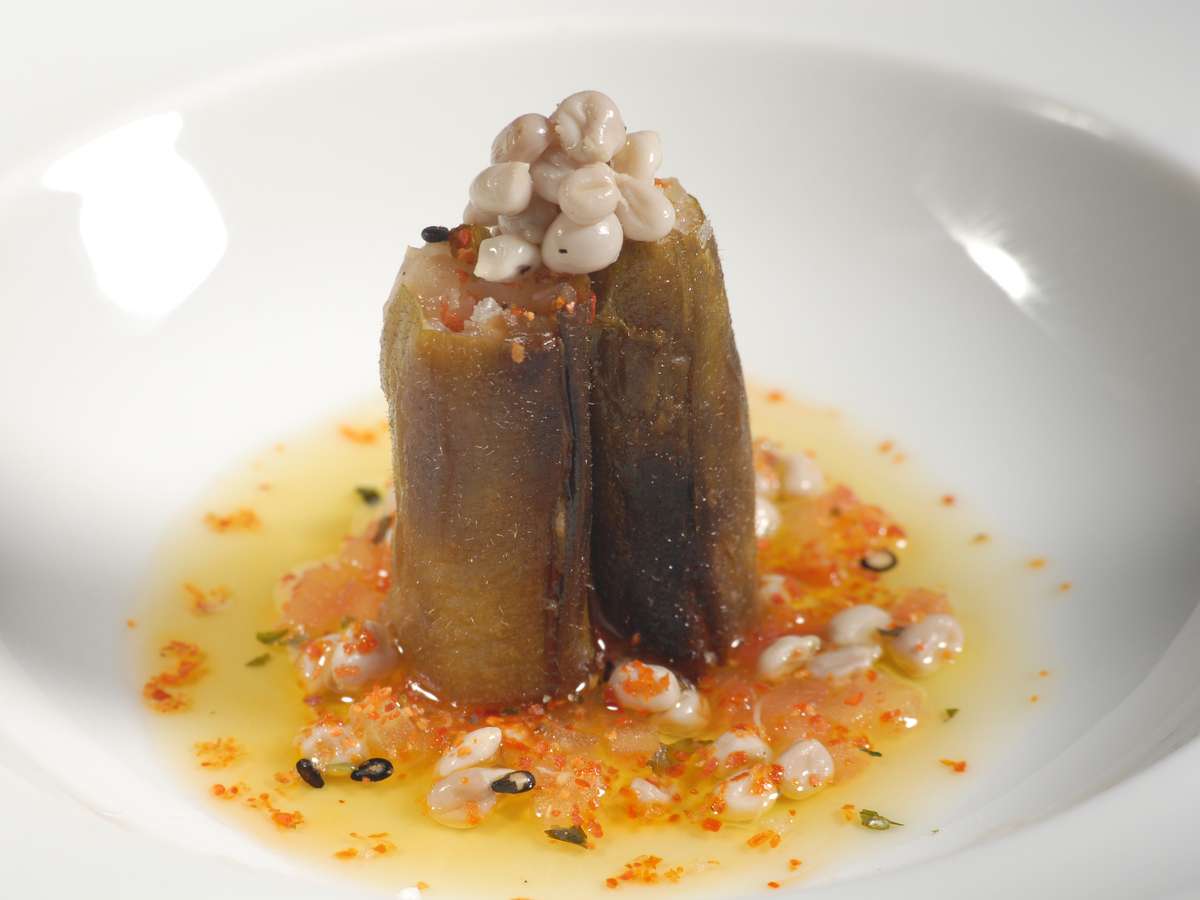 Recheie os filés de quiabo com as lâminas de camarão e mantenha refrigerado. As ovas de tomate: corte os filés de tomate bem gelados em cubos muito pequenos, do tamanho de ovas de salmão. Mantenha bem gelado. Tempere as sementes de quiabo com sal e um fio de azeite.