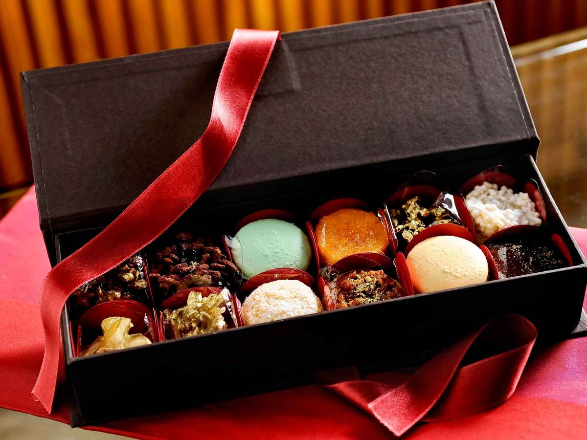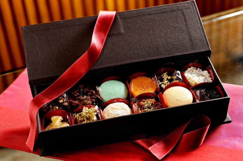 Kit Cachepô de Natal com um espumante baby Chandon, dois bem-casados, um brownie decorado, três biscoitos amanteigados decorados, um cupcake decorado, além de caixa com cinco macarons. Por R$ 132. Da Nina Veloso Pâtisserie. SAC: (11) 3032-6453