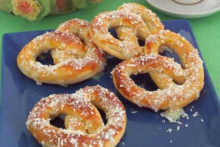 Transfira para uma fôrma untada com óleo. Pincele o pretzel com o ovo ligeiramente batido e leve ao forno médio, preaquecido, por 20 minutos ou até dourar. Retire e pincele com o leite condensado. Polvilhe com o coco e sirva em seguida.