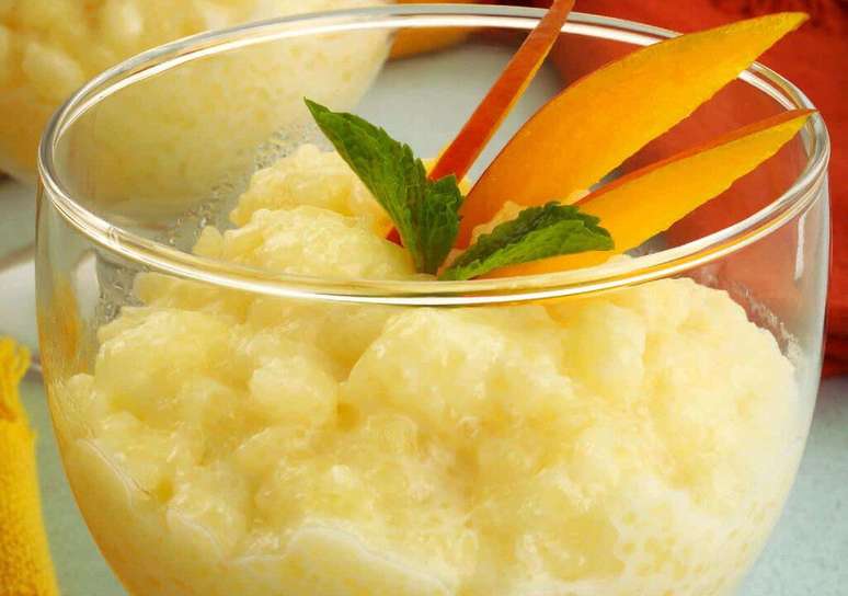 Misture a tapioca com o leite e o leite condensado e deixe descansar por 20 minutos. Em uma panela, leve ao fogo baixo, mexendo sempre, até engrossar. Divida em tacinhas individuais e decore com a manga e a hortelã. Leve à geladeira por 2 horas antes de servir.