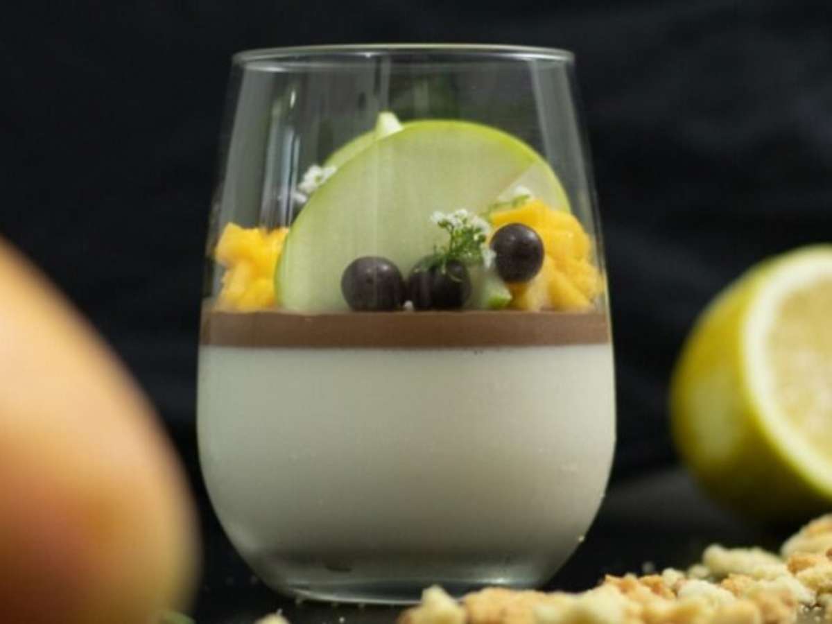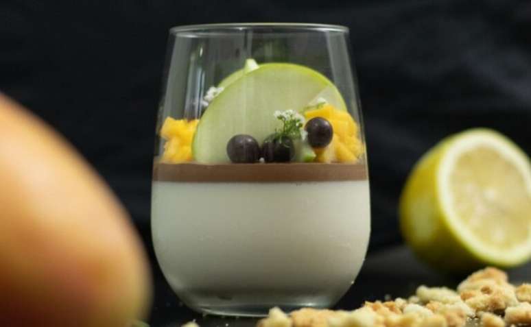 Depois, acrescente uma camada fina, de aproximadamente um dedo de espessura, do seu ganache em cima da panna cotta. Para finalizar a apresentação da sua receita, adicione as frutas - manga e maçã verde - picadas, as bolinhas de chocolate crocantes e o crumble. Prontinho, é só servir!