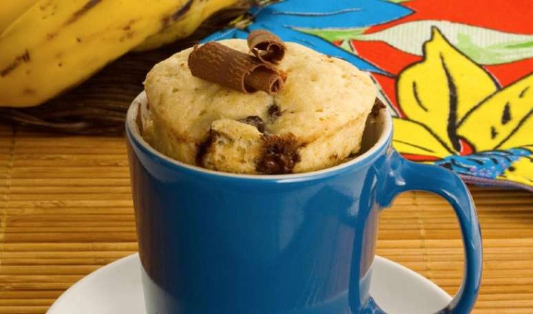 Derreta a margarina em uma vasilha no micro-ondas por 10 segundos em potência alta. Adicione a farinha, misture bem e leve ao micro-ondas por 10 segundos. Misture o leite, e leve ao micro-ondas por mais 30 segundos, mexendo na metade do tempo. Acrescente a gema e a banana e misture. Na batedeira ou com batedor manual, bata a clara em ponto de neve com o sal e o fermento. Misture delicadamente à massa junto com o chocolate e despeje em uma caneca de vidro ou cerâmica com 300ml de capacidade e leve ao micro-ondas por 3 minutos ou até assar. Sirva em seguida. Se desejar, decore com raspas de chocolate.